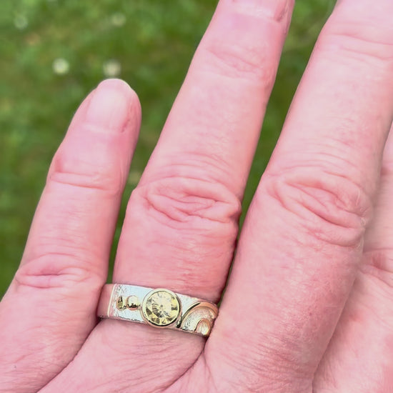 This is a gorgeous silver ring worked with 18ct yellow gold detail and set with a natural brown diamond in 14ct yellow gold rubover setting. The diamond is 0.75ct in weight. The ring weight is 7.7gms. Width is 6mm. Ring size is Q, can be resized.