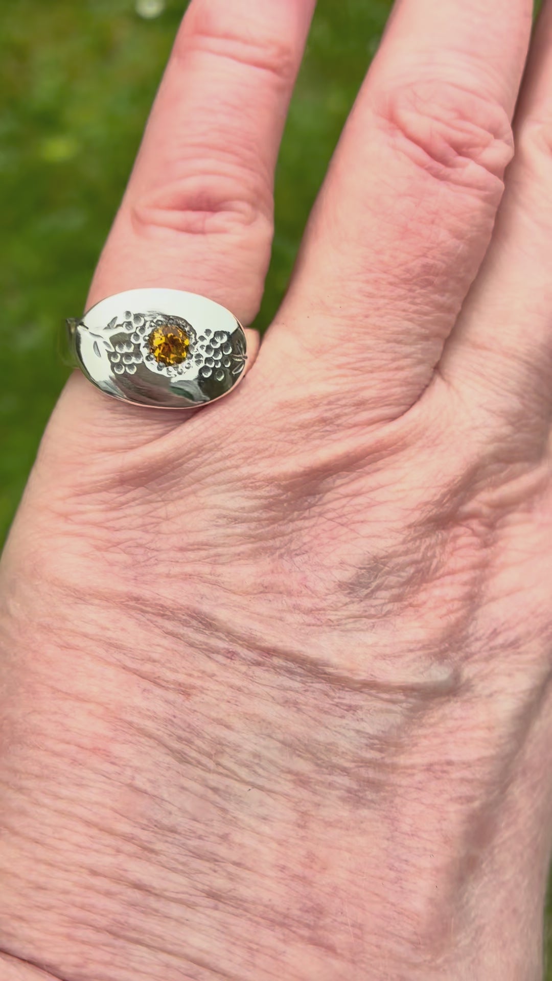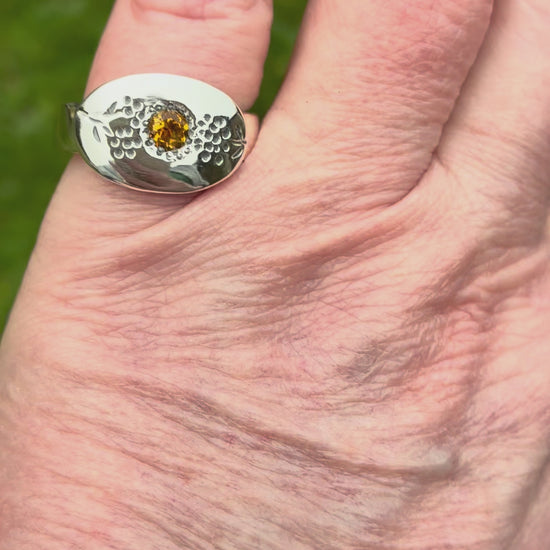 A chunky silver ring set with a 4mm citrine gemstone. The front width is 12mm x 18mm. The ring width is 5mm x 3mm. Ring size is N.