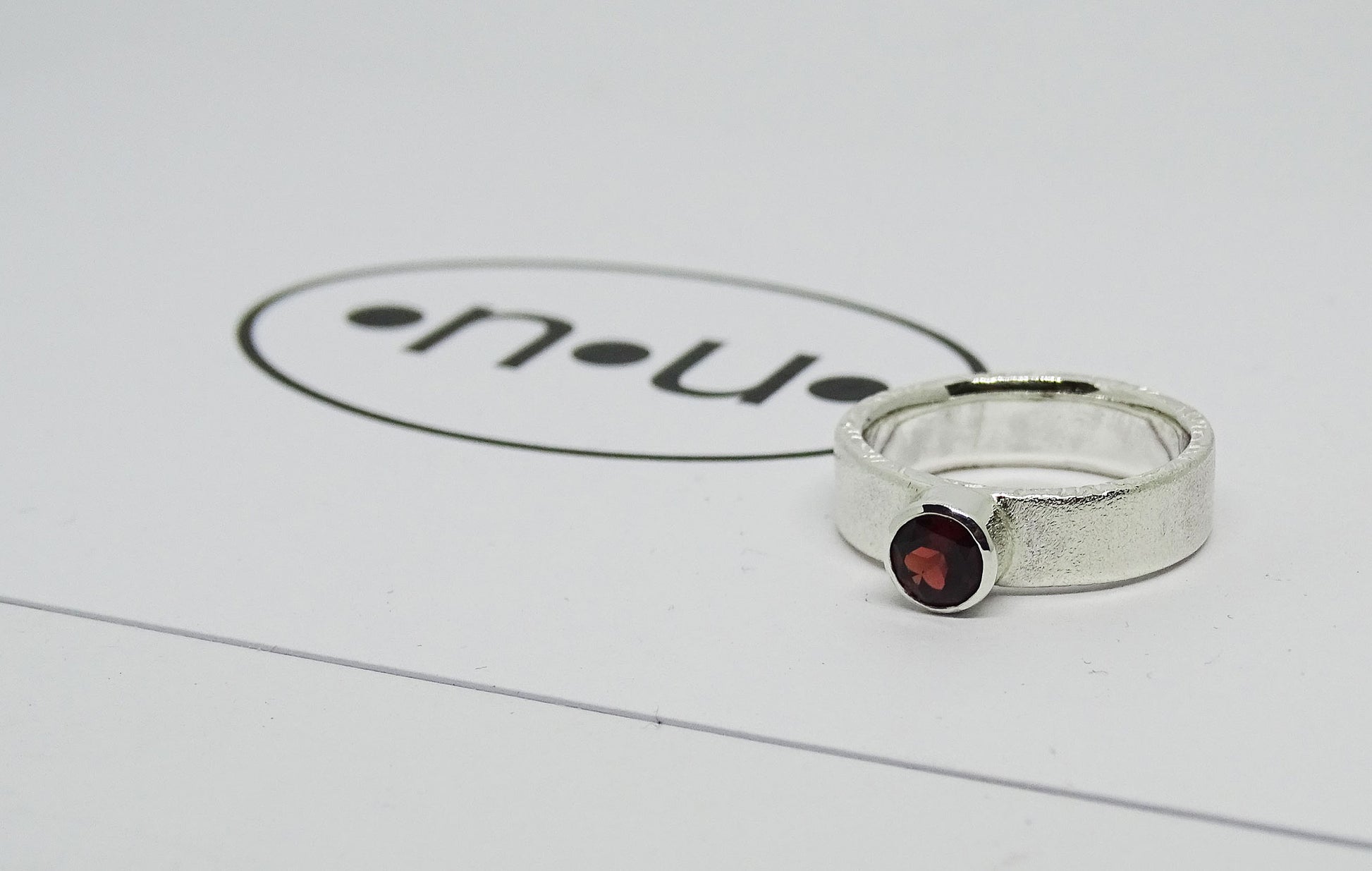 Silver ring set with a 6mm Garnet. Width is 6mm. Ring size is R. weight is 7.4g.