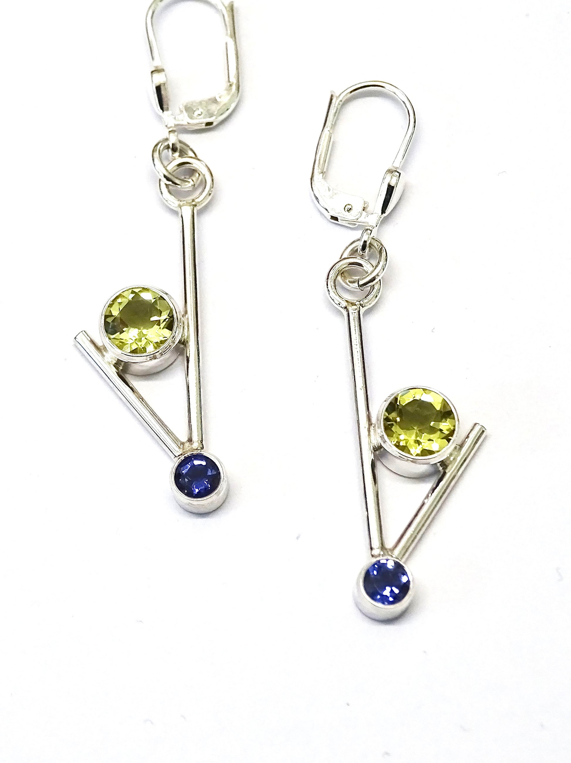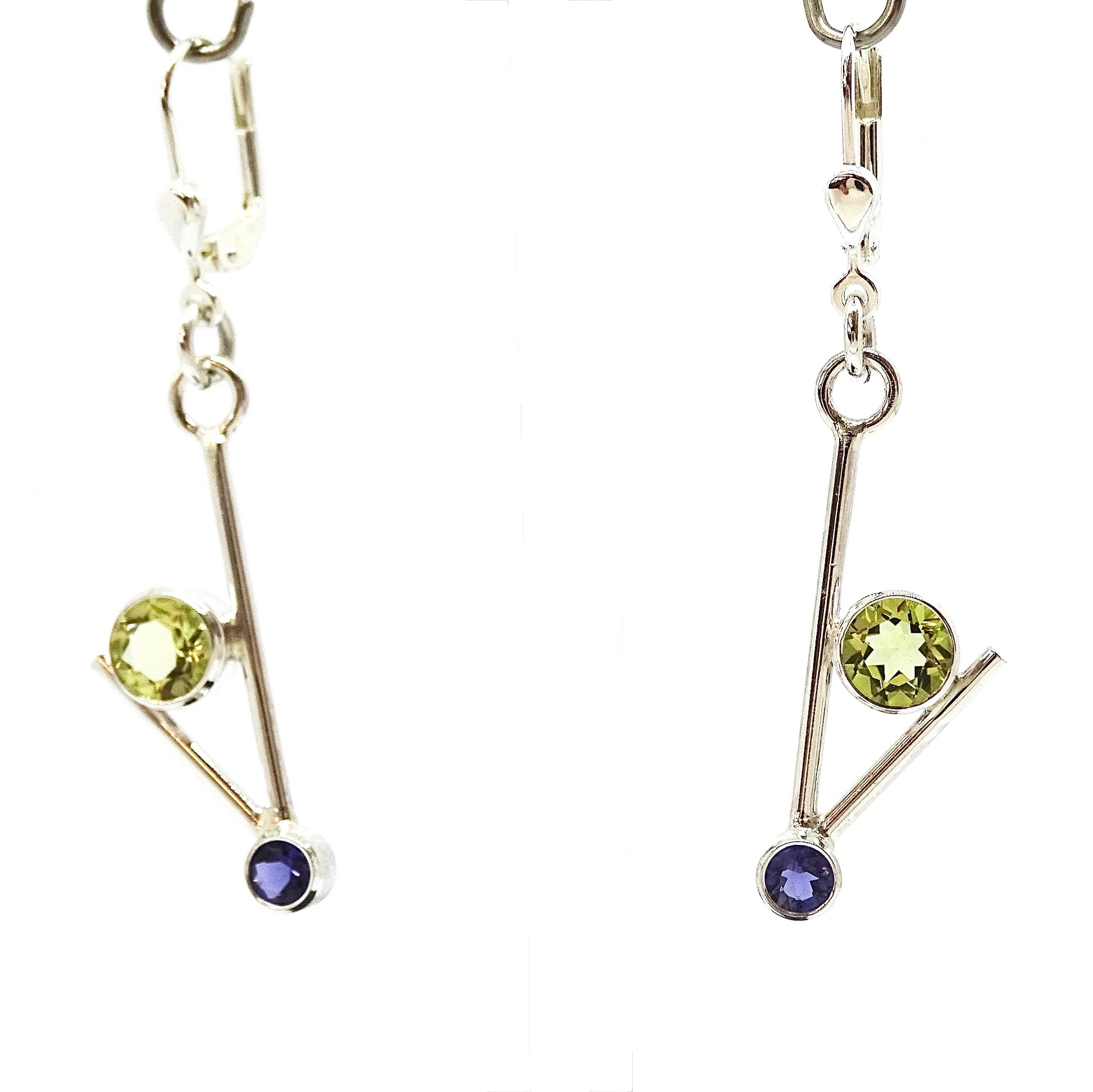 Silver earrings set with a 6mm lemon Quartz and a 4mm Iolite.