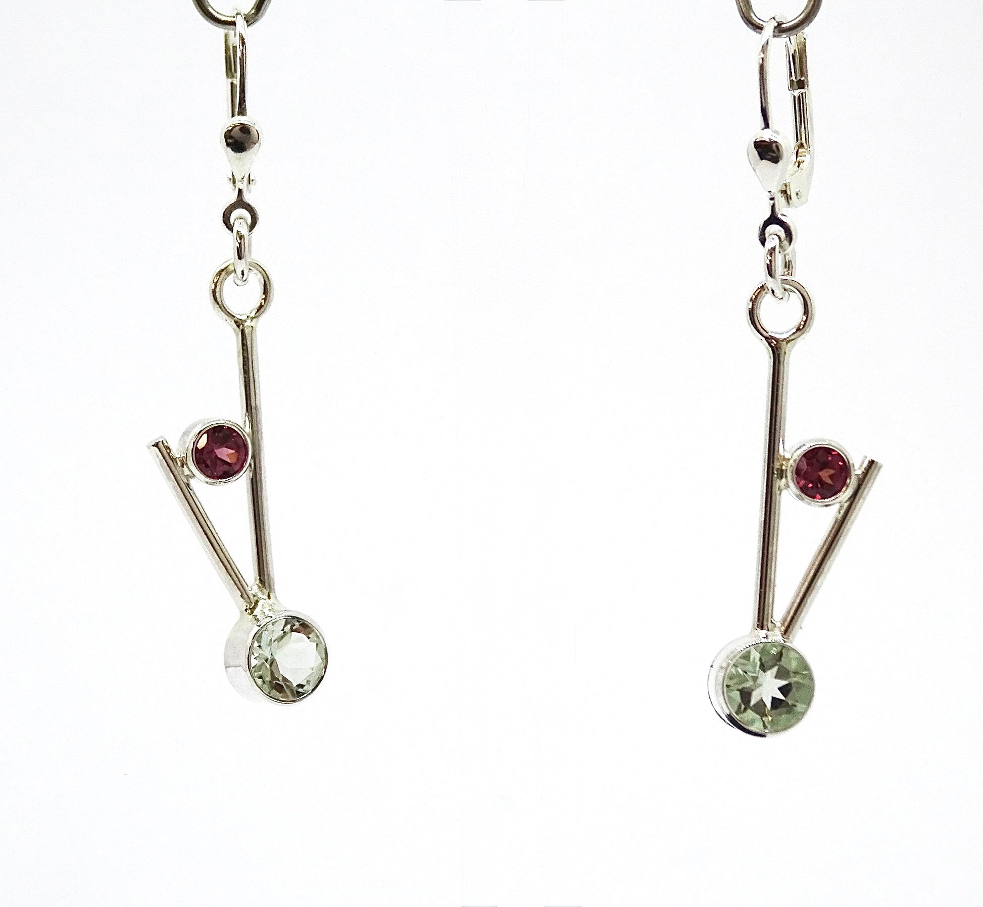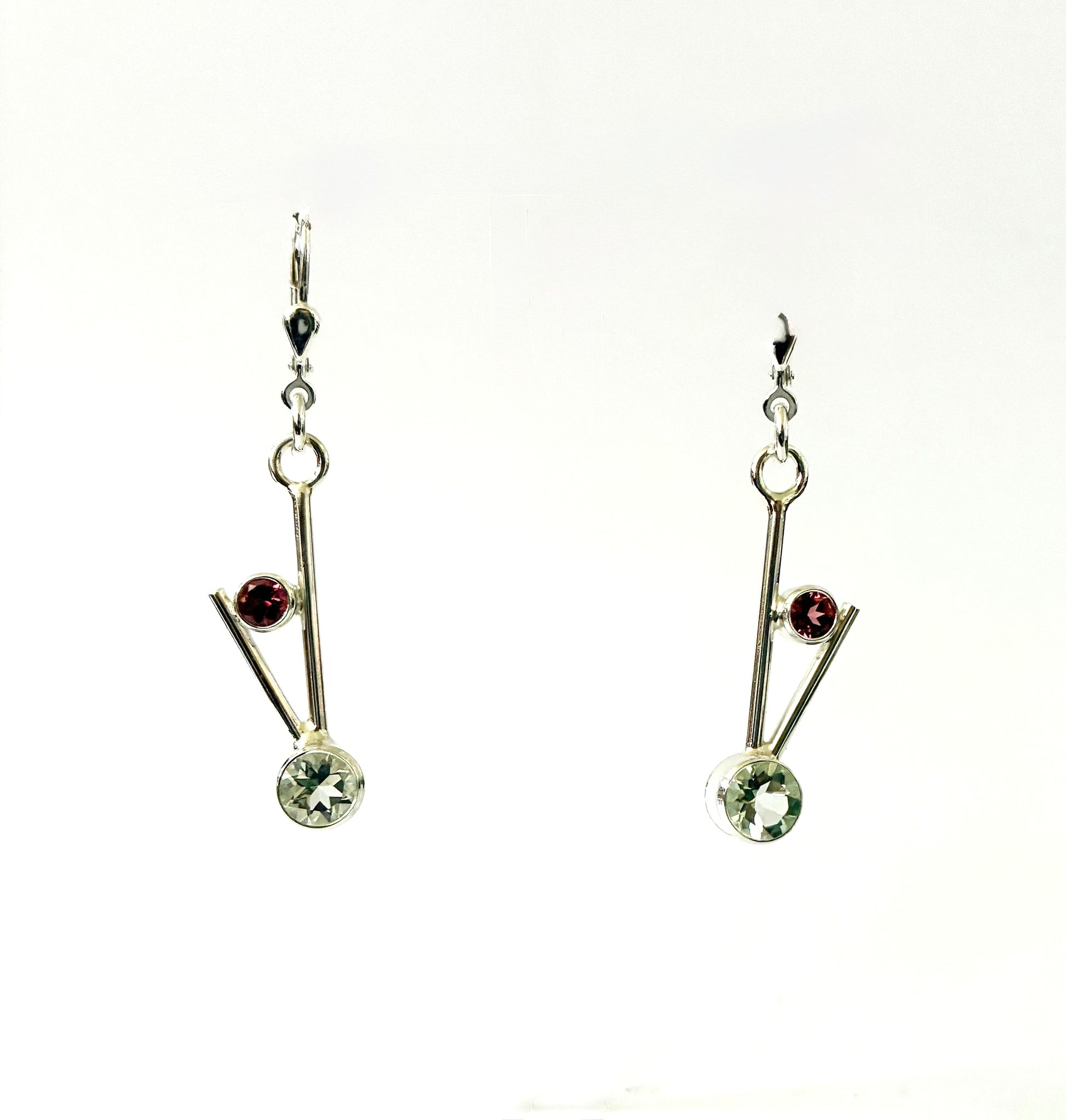 Silver earrings set with a 6mm mint Quartz and a 4mm Rhodolite.
