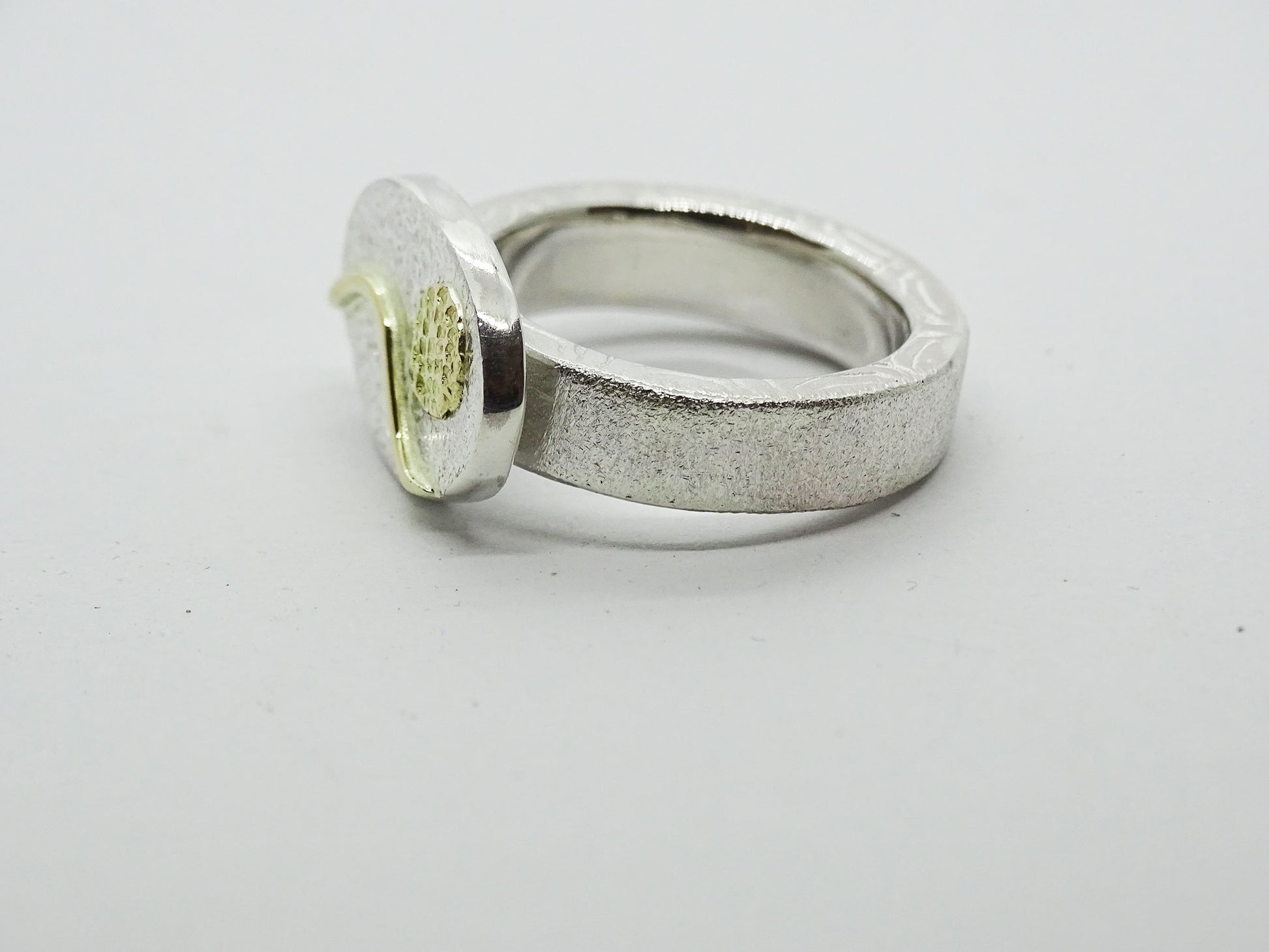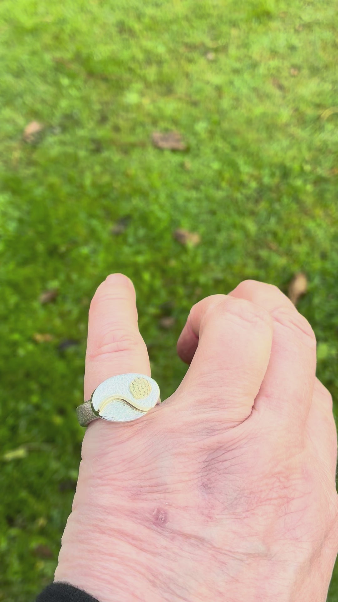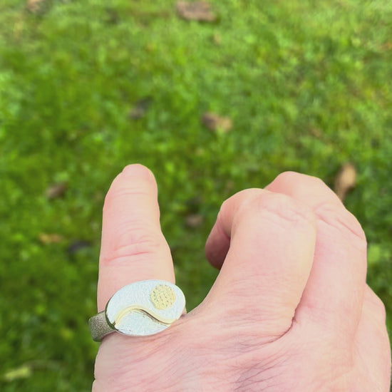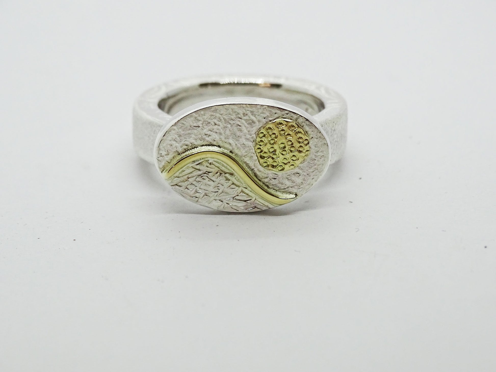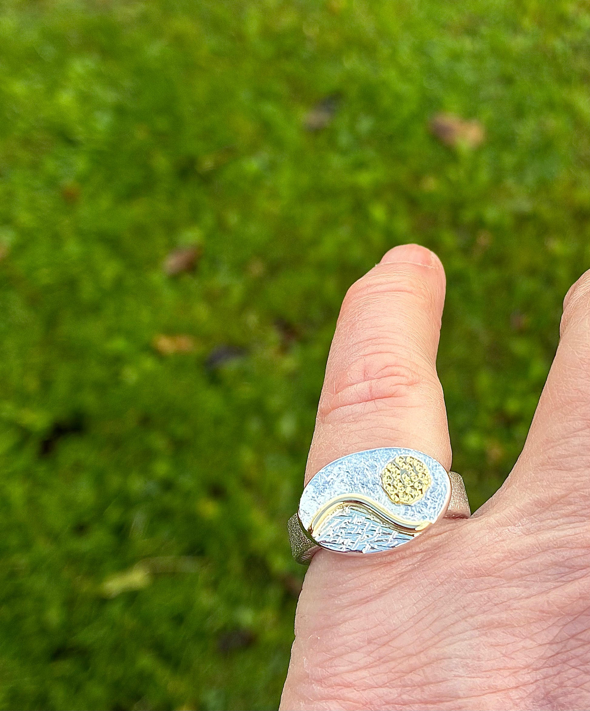 A chunky silver ring with an oval top. 18ct yellow gold detailed mountain and sun.