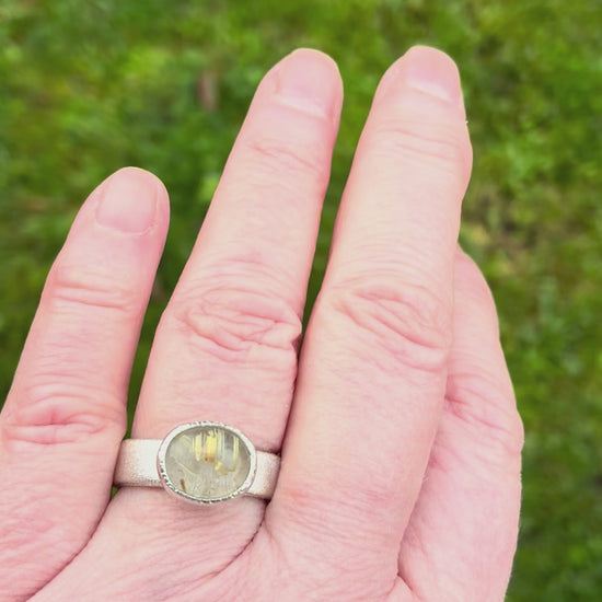 A silver ring set with a rutile quartz. Band width is 6mm. Ring size is Q+.