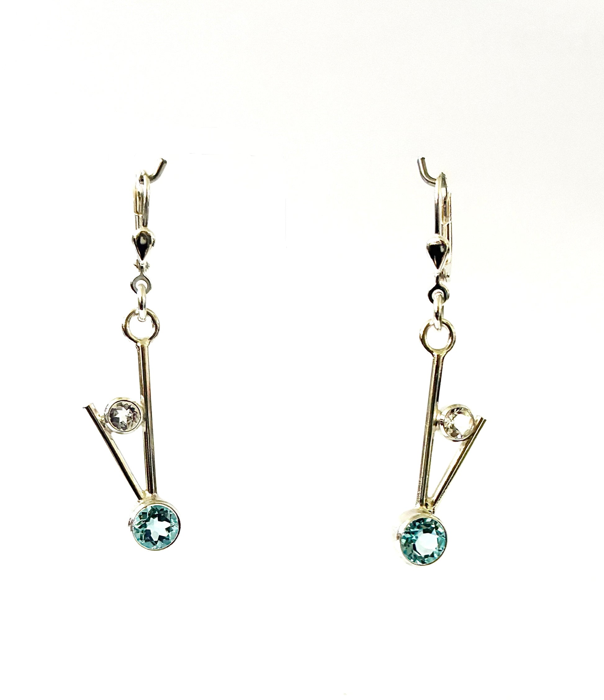 Silver earrings set with a 6mm sky blue and a 4mm white Topaz.
